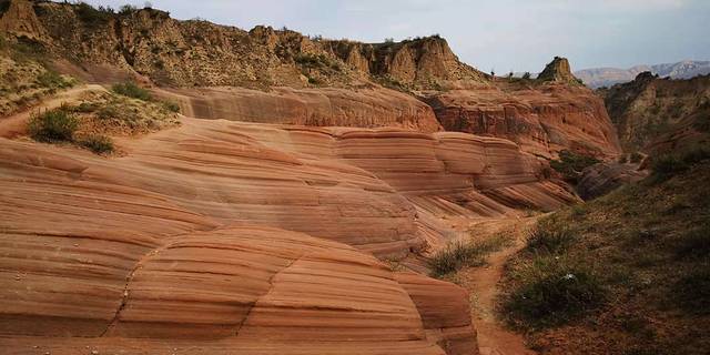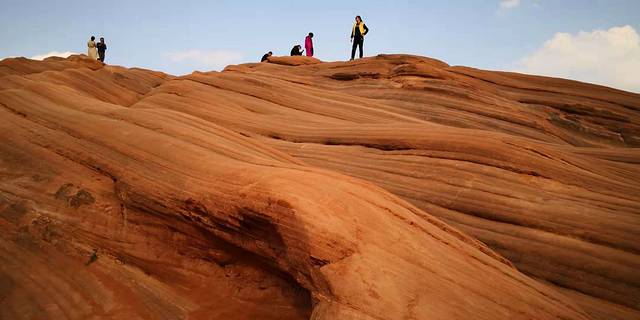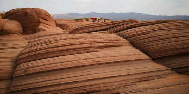 靖边波浪谷岩石叫红砂岩,由数百万年的风、水和时间雕琢砂岩而成的奇妙世界。波浪谷岩石的复杂层面,是由一亿五千万年前侏罗纪就开始沉积的巨大沙丘组成。沙丘不断地被一层层浸渍了地下水的红沙所覆盖,天长日久,水中的矿物质把沙凝结成了砂岩,形成了层叠状的结构。