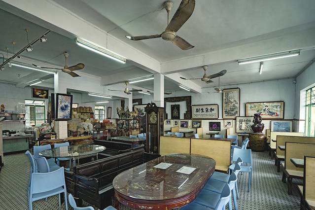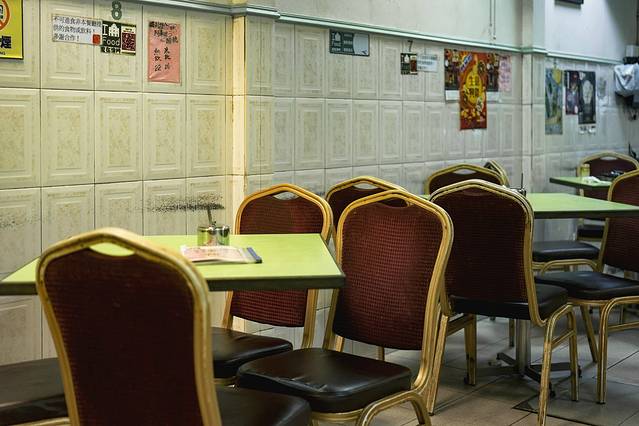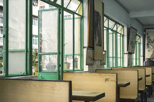 作为澳门最早一批老牌茶楼的一员,开业于1962年的龙华茶楼可以说是传承了半世纪的粤式饮茶文化。踏着绿白相间的小格子方砖走上二楼,宛若走进港产片的片场:摇曳的吊扇、折凳与卡座、绿色铁窗,还有书画挂满墙壁。这不是怀旧,这不是复古,这就是它本来的样貌。