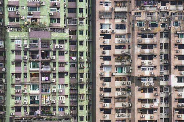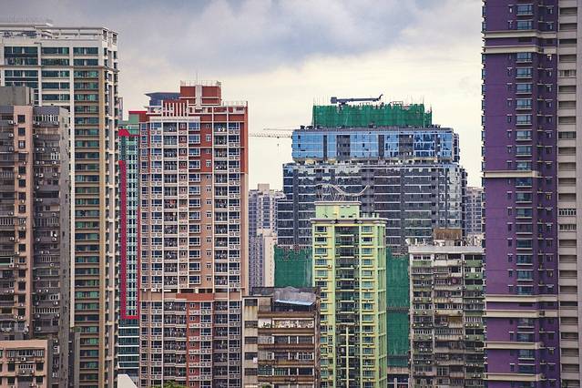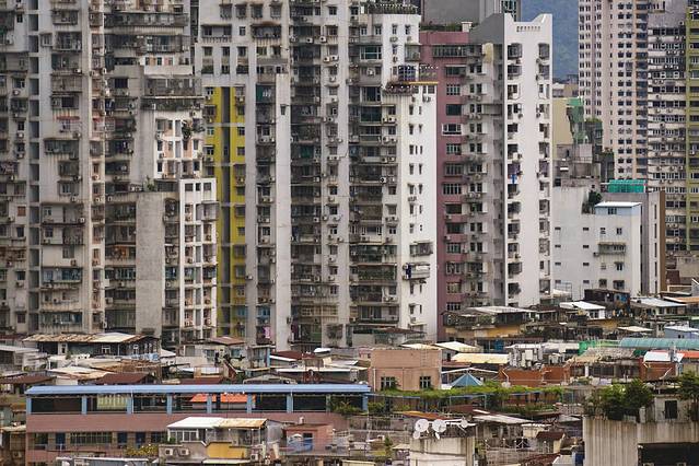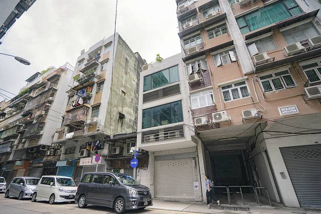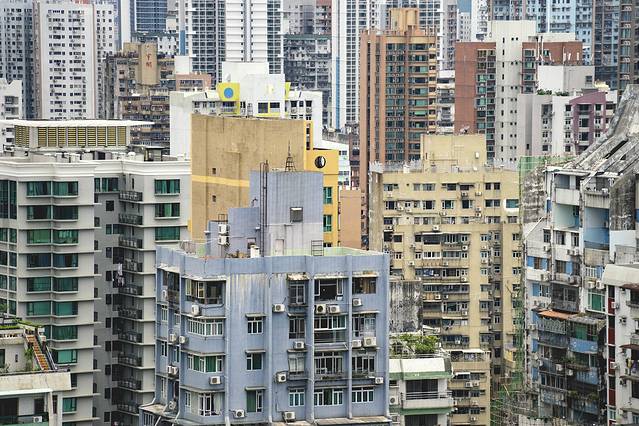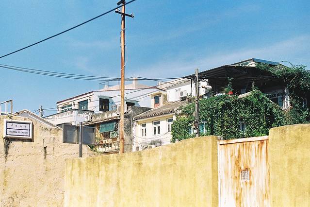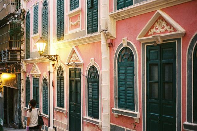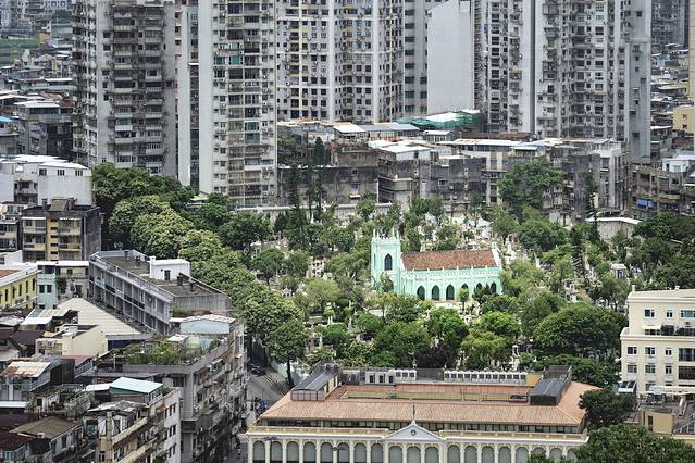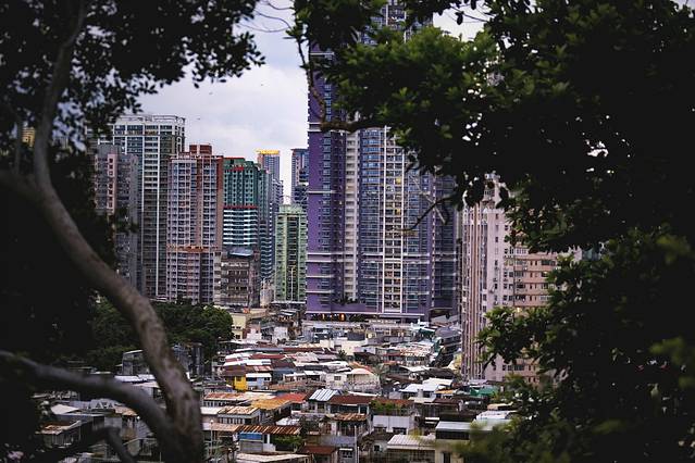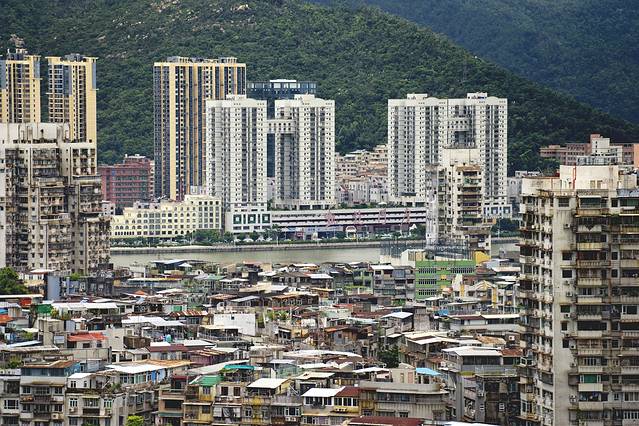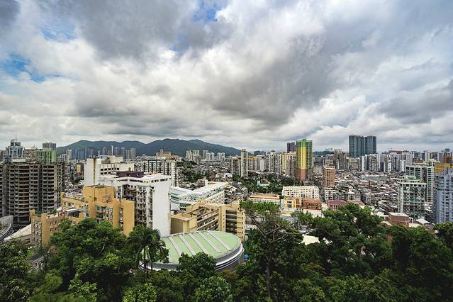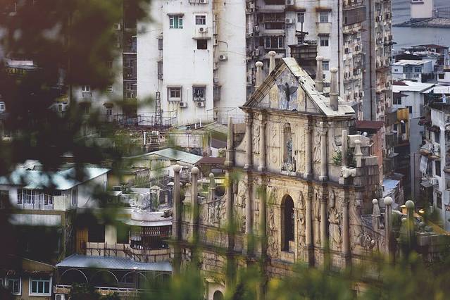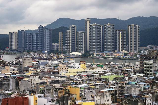 相比起香港楼宇的密集,澳门的楼宇密度也是不遑多让,还带有强烈的色彩对比,远远看去像是堆砌起来的乐高积木。