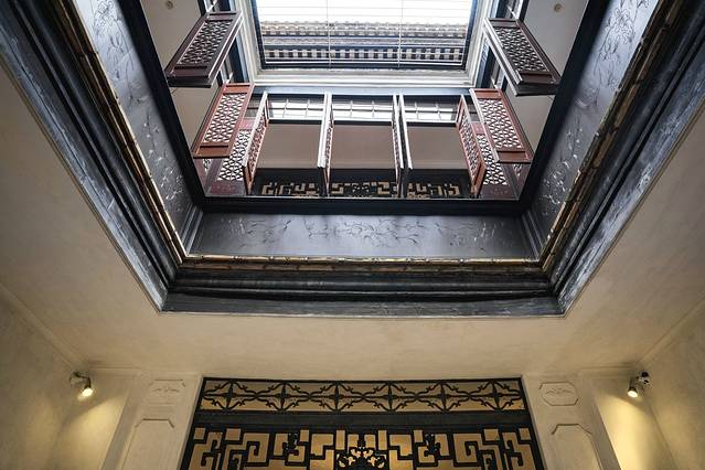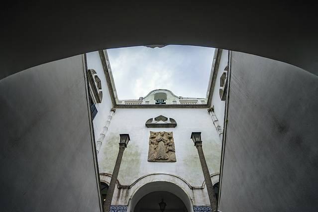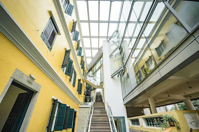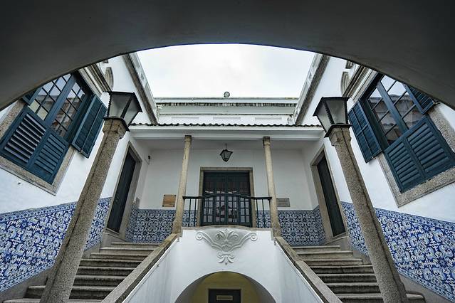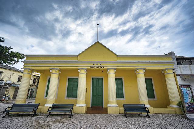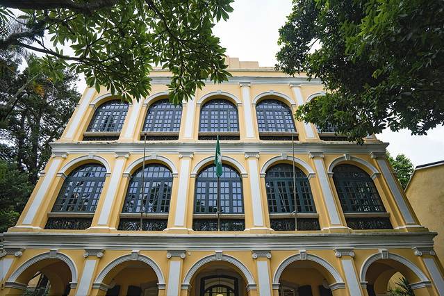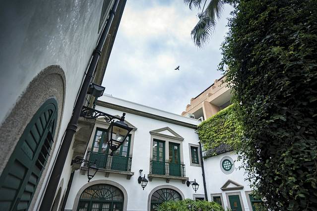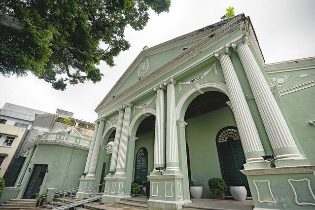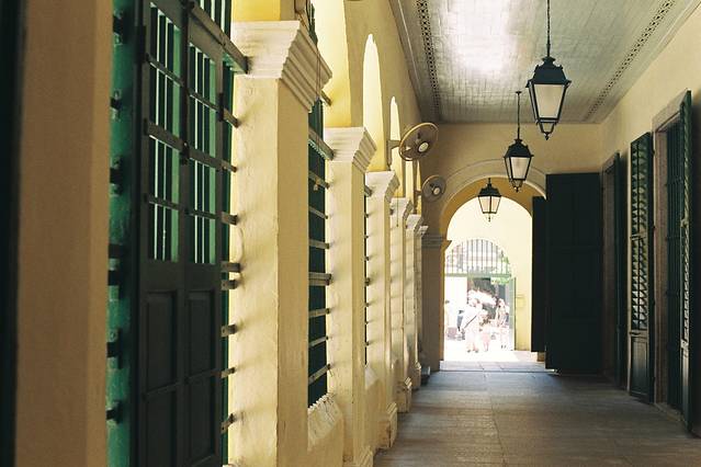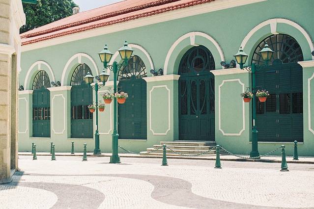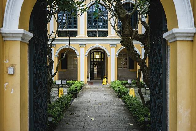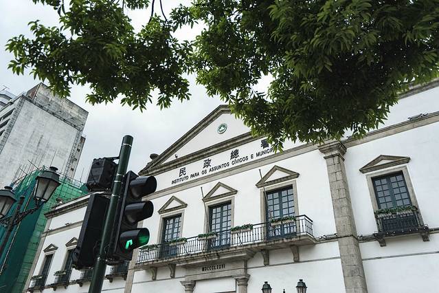 议事亭前地的喷水池区域永远熙熙攘攘,热闹程度堪比小型集市,而与其一街之隔的民政总署大楼却显得安静许多。然而它的来头一点也不小,从议事局办公室、政府办公室、卫生署、法院,到今天的民政总署大楼,见证了澳葡几个世纪以来行政制度的变迁。大楼外立面为白色灰泥配墨绿色门窗,典型的南欧建筑风格。大楼内部右侧是展览厅,左侧则用作办公用途。因为是政府机构,所以内部供参观的区域并不多,包括二楼气派的会议大厅等都没有对外开放。