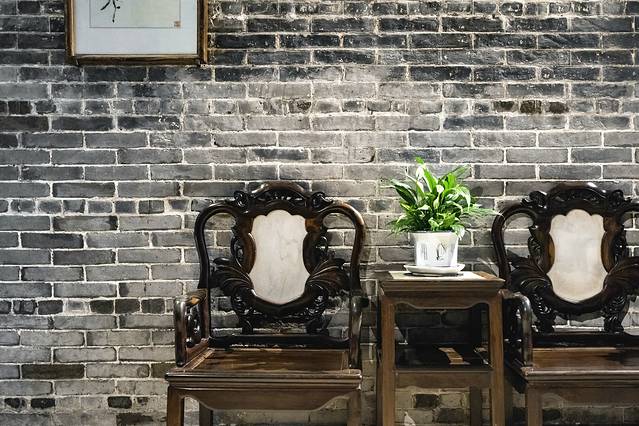 大厅一角,字画与青砖、木制家具与盆栽,这样的搭配隐隐透露着清高典雅的韵味。