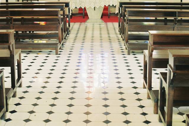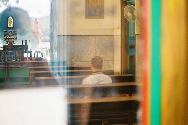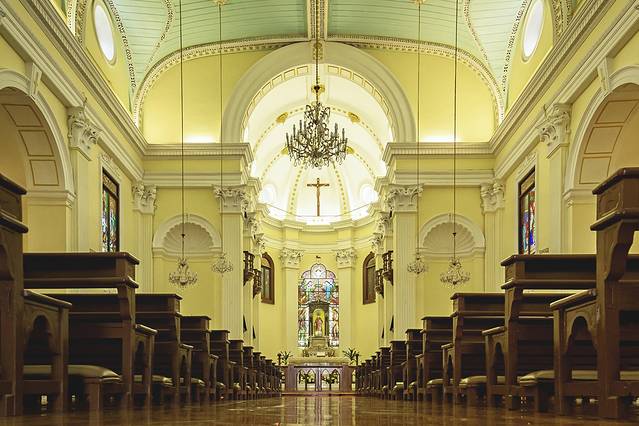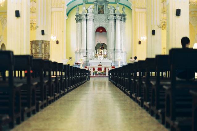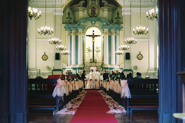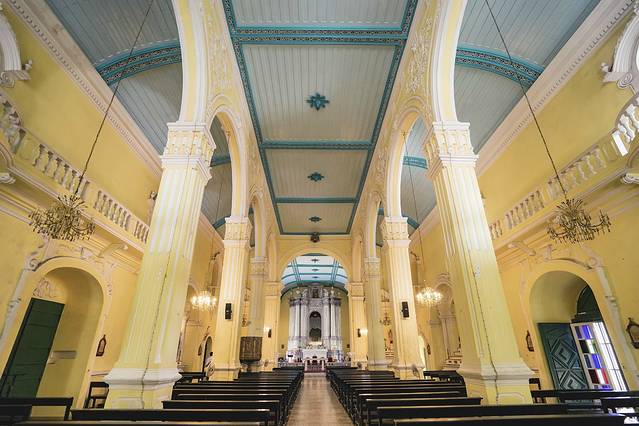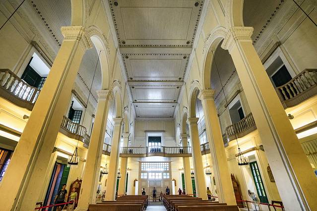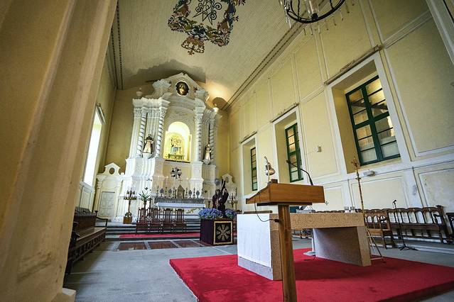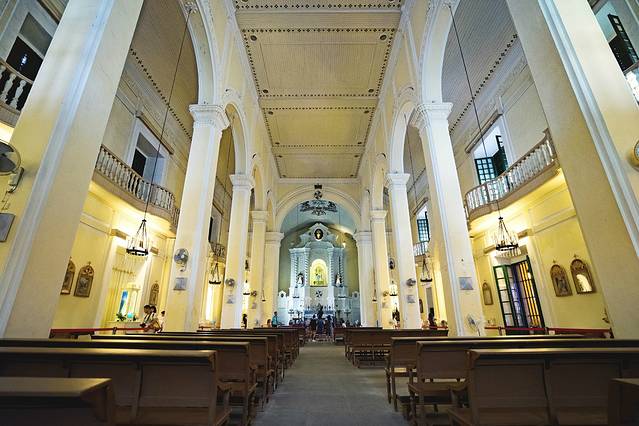 教堂内部的装饰则带有巴洛克风格。祭坛两侧采用断裂扭曲的山花和壁柱重叠错落的形式,中间是耶稣被钉在十字架上的塑像。两侧座椅上方的天花上还垂下多支华丽的枝型大吊灯。就内部的观感上来说,圣安多尼教堂比年纪相仿的玫瑰堂更对上我的口味。此外,因为圣安多尼是天主教所奉的“婚姻主保”之神,所以教堂也被叫做花王堂,这里也是许多当地人行礼的地方。