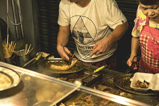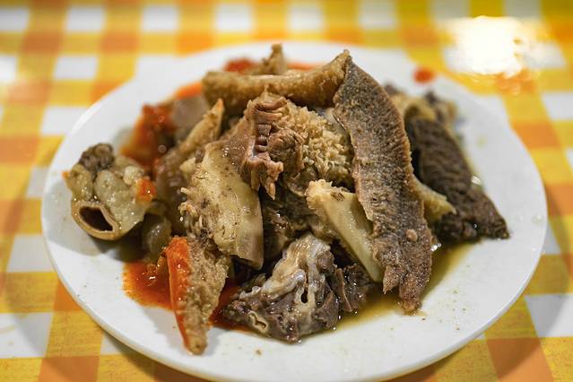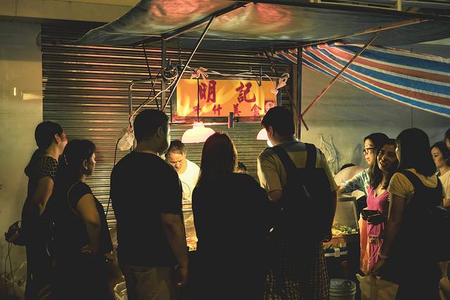 躲藏在新马路一巷口中的明记牛杂,出没时间一般是晚上9点半,通常至凌晨1点,卖完便收摊。店主一家三口以手推车形式经营了多年,培养出一批批捧场客,因此夜里不用怕找不到它,在新马路上看到长长的队伍围着的,便就是明记。