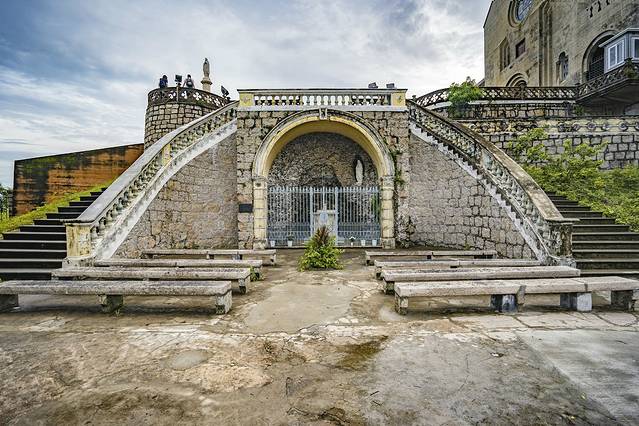 教堂前方是一片平台,尽头处同样立有圣母像。平台下方是圣母岩洞,拱门中的岩石间,也放置了一尊圣母像。岩洞前设置了8排低矮的石凳供教徒跪拜用。