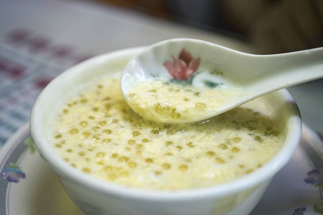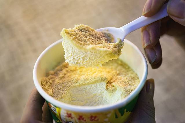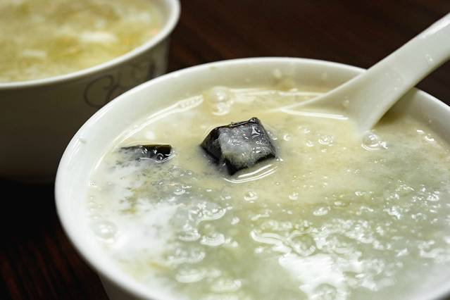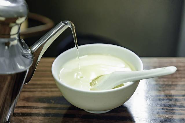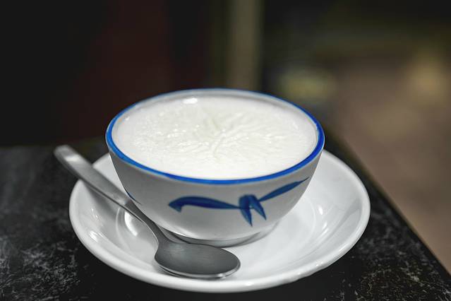 原料纯正、手工研磨、新鲜制作,如此出来的豆腐花未品尝便已知其质量。豆腐花平整顺滑,豆香扑鼻,动手之前,先加入姜糖水,再混入些许淡奶。轻舀一块放入口中,那种滑不溜口的口感实在是无出其右,难怪60年后李康记依然客似云来。