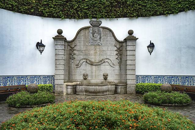 拾级而进,在石阶上方的拱顶处置有一块雕刻着葡萄牙皇后唐娜•莱奥诺尔雕像的浮雕。而正中央下方则有一口石制古井。