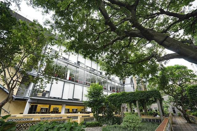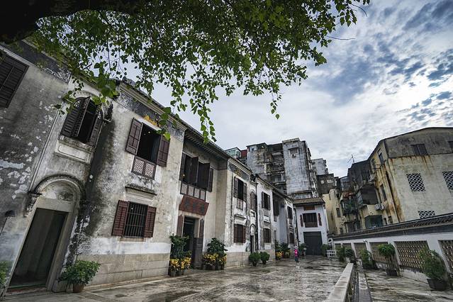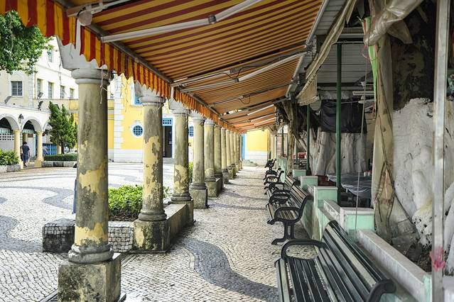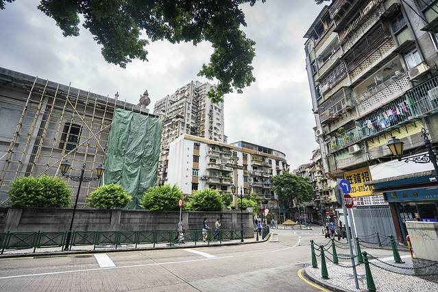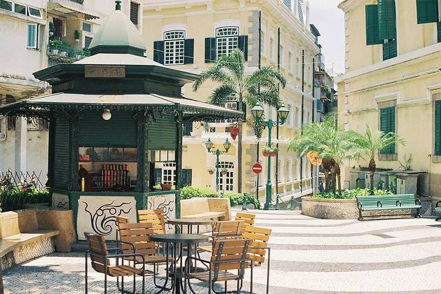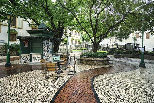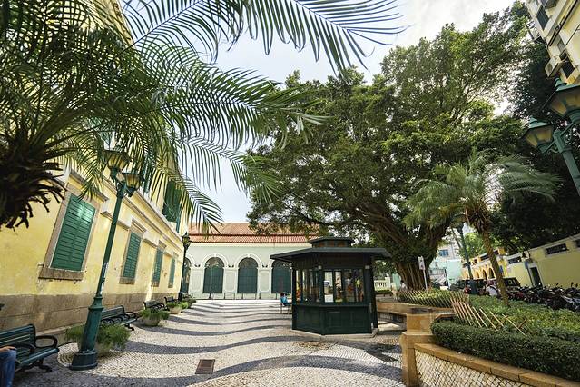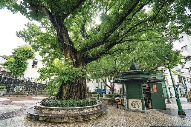 既被列入世遗名录,附近便少不了历史建筑。经过重修工程后的亚婆井前地,仍保留着许多充满南欧风情的古旧建筑。西式楼房作前景,正中有老树作衬托,再辅以花阶砖、仿古灯柱、铁艺报刊亭作点缀,澳门从不缺这样清新古老但又舒适的小广场。