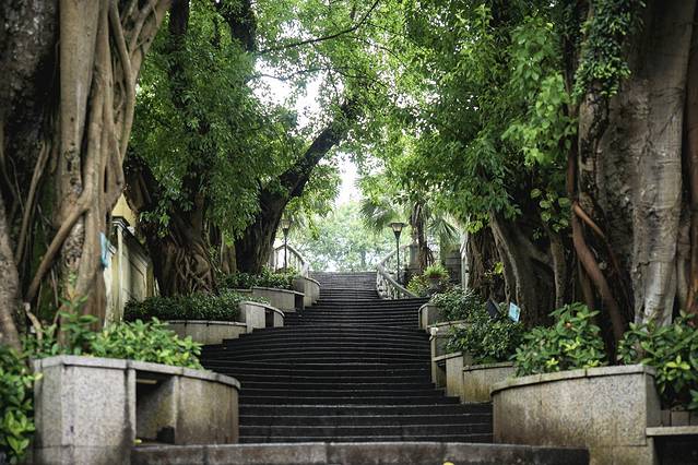 登上东望洋山山顶可以选择从东望洋斜路直上,因为地面崎岖以及坡度大,所以这里又被叫做长命斜。当然也可以选择省力省时的方法,东望洋山山脚连接着二龙喉公园,公园入口附近建有松山缆车,单程2元葡币,2分钟不到就能直达山顶健康径。东望洋山同时也是俯瞰澳门全景和四周岛屿的又一高点,建议临近黄昏时到来,景观和氛围都相当不错。