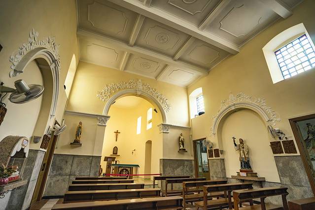 紧挨着松山灯塔的是圣母雪地殿教堂。与灯塔一样,教堂同样以米白色外立面为主,辅以黄色框线作为点缀。教堂建于17世纪初,建成后不久便遇上荷兰人入侵,传说圣母曾在教堂外以斗篷抵挡敌军的炮火。现在教堂内除了展示有绘有圣经故事和人物的彩色壁画遗迹外,还供有圣母的圣像。