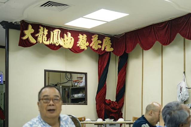 茶楼在一楼靠近厨房位置辟出一角作为大龙凤曲艺茶座,座上挂有粤剧艺人登场的剧照。每天下午,茶楼都会有地道的粤曲表演,或是邀请戏班表演,或是茶客即兴落座。听戏时间,只需低消55葡币,就能在这里听上一段段熟悉的“唱念作打”。