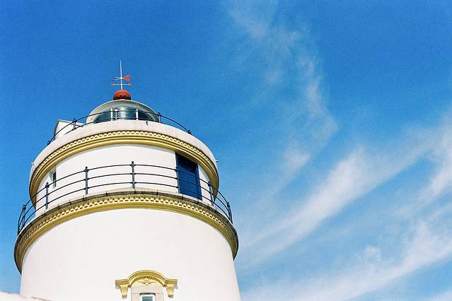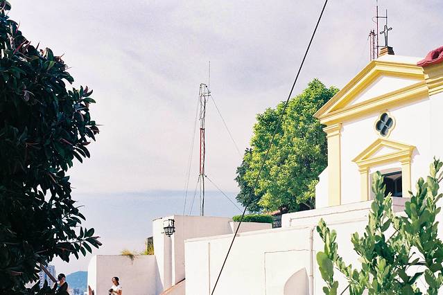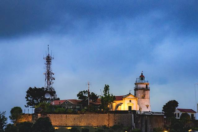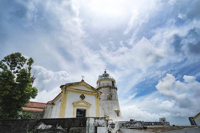 远处的东望洋炮台,另一个俯瞰澳门的好地方,它与大炮台及妈阁炮台一同组成一道坚固的外围军事防线,用以防范海盗。相比起山下永远People Mountain People Sea的大三巴牌坊,大炮台则要安静许多,不仅可以从另外的角度欣赏大三巴,而且还是俯瞰澳门的好地方。关于澳门能登顶俯瞰的地方还有几个,下面会逐一介绍到。