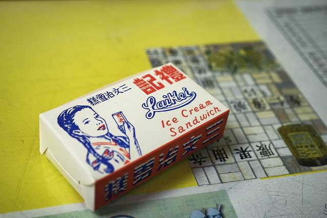 一家老字号冰室能走到今时今日,绝不止是怀旧这么简单。主打的雪糕产品以当季水果作原料制作,奶茶、三文治、公仔面等食品始终在水准之上。当然少不了店内的招牌产品三文治雪糕,用威化饼夹着密瓜、椰子、香草三种味道的雪糕,走的是粗糙颗粒路线,一口下去,威化和雪糕两种不同口感交织在一起,十分特别,据说连三文治雪糕包装上的女性肖像是礼记的创始人手绘而成。装潢、出品、包装都停留在过去,这是一家被“冻住”了时光的老字号冰室。