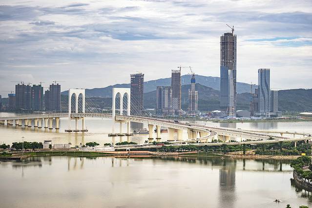 往南一点点,还可以拍到连接半岛和氹仔三大桥之一的旧澳氹大桥。旧桥一般是当地人的称呼,大桥全名叫嘉乐庇总督大桥,于1974年正式通车,中段突起成三角弧形,很有意思,我小时候最喜欢走这座桥了。