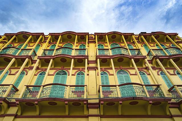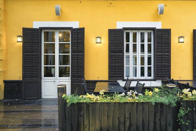 疯堂斜巷一带具有比其他地方更为强烈的南欧西葡风情,甚至地面上铺设的也是与葡萄牙本土风格一致的马赛克地砖。沿着疯堂斜巷往下走,在与疯堂新街的交界位置,多座黄绿红相间的三层建筑更是将这种南欧风情表现得淋漓尽致。