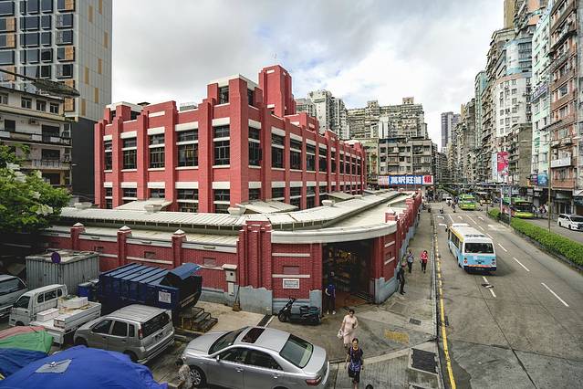 龙华茶楼旁边的红墙白瓦建筑就是这一区域的小地标红街市。除了附近的公交站都是以它来命名外,红街市还是目前唯一被列为澳门文物名录的街市类建筑。