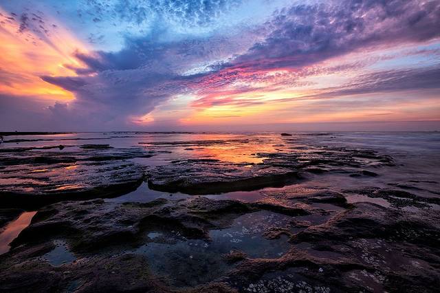 建议退潮的时候去五彩滩,只有这个时候,你才能看到这些神奇的地质景观。你可以留意平台上一道道的海蚀沟,这些海蚀沟在涨潮的时候,你是看不到的。平台上的青苔和海水在朝阳的照映下,五彩斑斓,十分漂亮。大部分的人会选择拍照留念,记录下这些美丽的时刻。