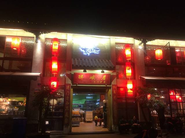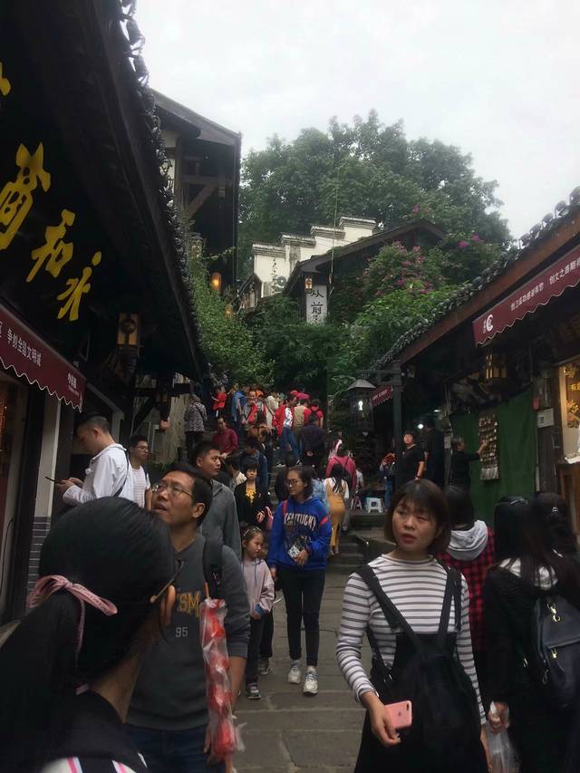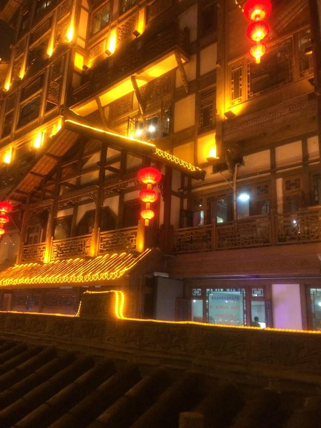 在车上远看的时候,景色更好。二楼和三楼是买工艺品、火锅底料什么的,一楼、四楼及以上是特色小吃和火锅。离我们最近的过来方向的那家烤猪蹄挺好吃的,隔壁的隔壁的那家串串也很香,就是太辣了点。