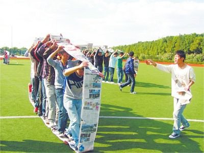 大家将报纸或者旧的横幅制作成一个履带,小组成员站在其中,等教练一声口号大家就一起出发,跟着小组的节奏,看哪个团队先到终点,这是一场轻松的团建游戏,很有年代感哦。