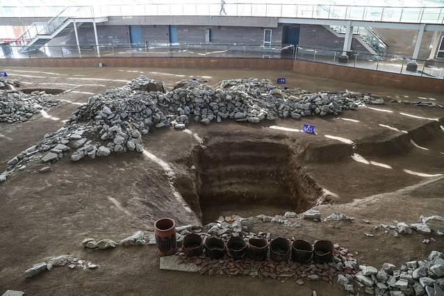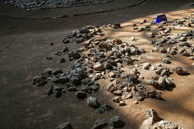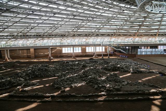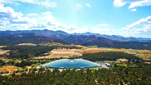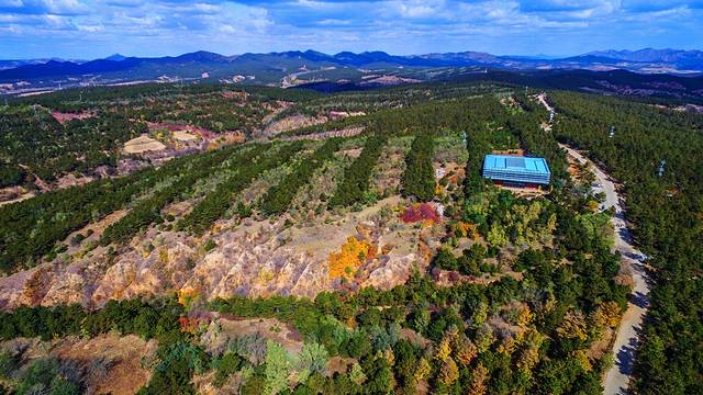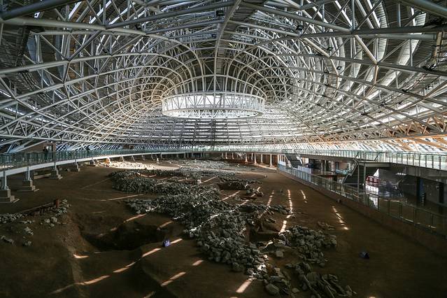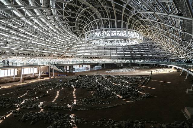 进入展示馆可以看到,供游客参观的环廊比地面高出2米左右,围绕馆内一周,观众可以从各个角度看到下面文物文体,其圆形祭坛居中。屋顶为圆形透明天井,与下面的红山文化形状相对应,整体钢结构框架呈现从中部向下放射状,没有做任何装饰,与文物遗址原生态保持一致。