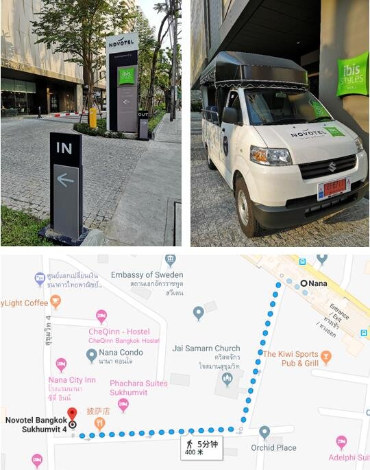 先和大家说一下这家NOVOTEL酒店的位置吧,这家分店在Sukhumvit 4素坤逸路4巷,打车或者坐BTS到NANA站下车从2号出口,往Sukhumvit 4素坤逸路4巷方向走大概5分钟就能达到。如果行李太多的话可以联系酒店前台,酒店星期一到星期五每天8:00-16:00,每30分钟就会有车来往NANA BTS站和酒店,周末的话会到19:30。酒店距离曼谷很有名的NANA娱乐区很近哦,NANA区大家都懂的,不懂的朋友自己百度一下笔者不方便做太多的介绍,hahahaha。