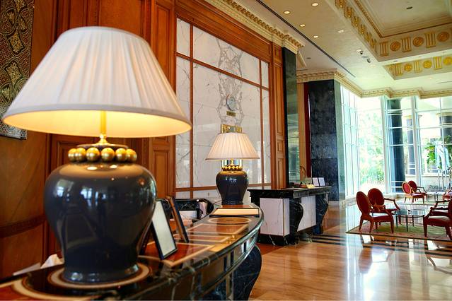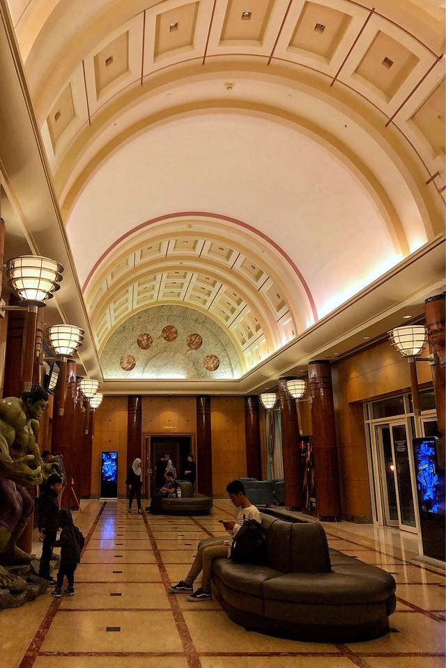 一进大厅就可感受皇室的气势,楼高15层的大厅、高耸的大理石柱镶着金箔、镀金的座椅、包金的楼梯扶手,加上钻石水晶灯的反射光,充满金碧辉煌的气派。