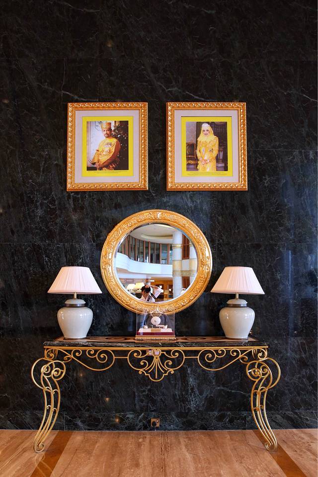 文莱作为一个君主国家,公众场合大多悬挂着苏丹哈桑和皇后的照片,以示对他们的崇敬。圆镜边框也少不了用金子镶嵌,处处彰显它的豪华富有。