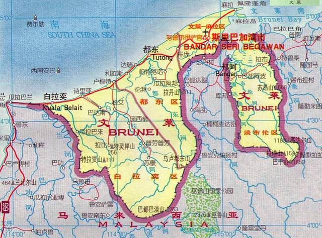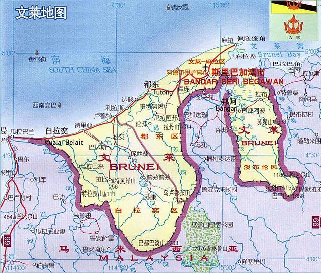 文莱位于亚洲东南部,北濒中国南海,东南西三面与马来西亚的沙捞越州接壤,并被沙捞越州的林梦分隔为不相连的东西两部分。