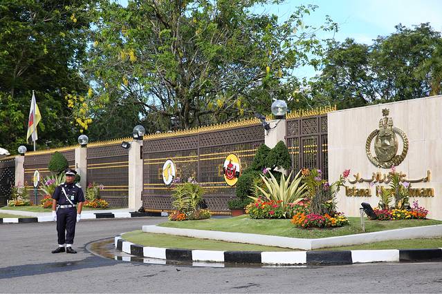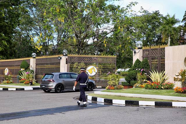 苏丹深受文莱人民爱戴,皇宫警卫不严,大门只有一人守卫。