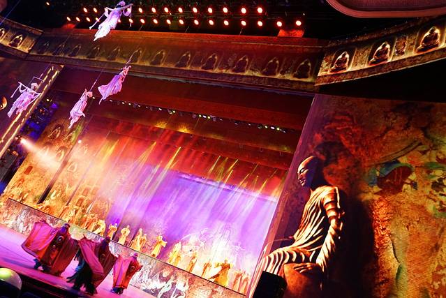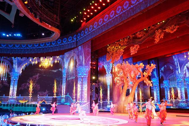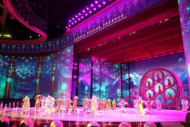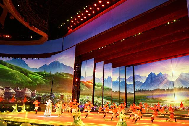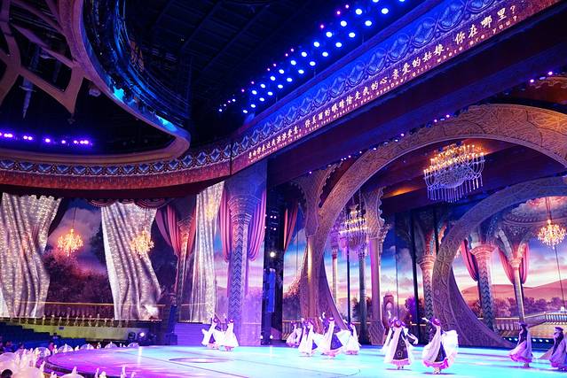 室内实景民族歌舞秀《千回西域》,将西域乐舞及现代新锐舞美与量身定制的36处立体实景、国际一流声/光/电/烟火/水幕等大型机械舞台装置融合,展示丝绸之路的歌舞盛况;包含了杂技武术、器乐演奏、歌唱舞蹈、走马飞鹰等多个表演领域。