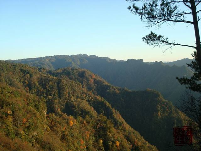 大风堡景区因常年大风不断,大风起时,风起云涌,林涛阵阵,而因此得名。此秋时海蓝色的天空下绵绵群山中红叶如花团锦簇般煞是漂亮。