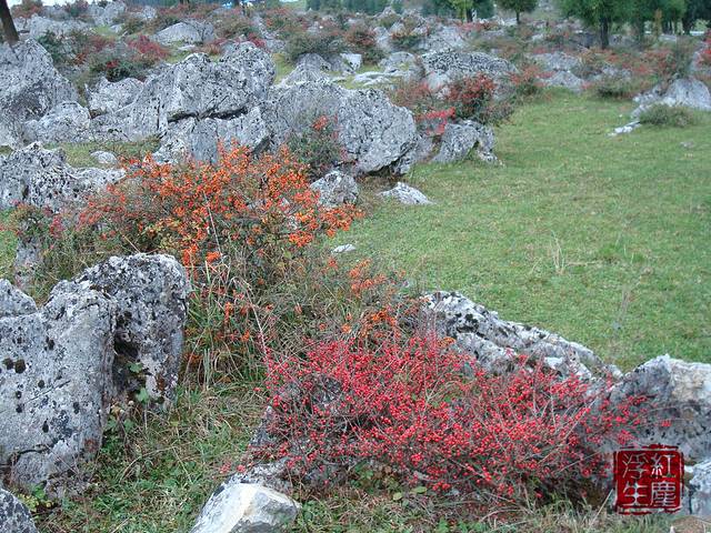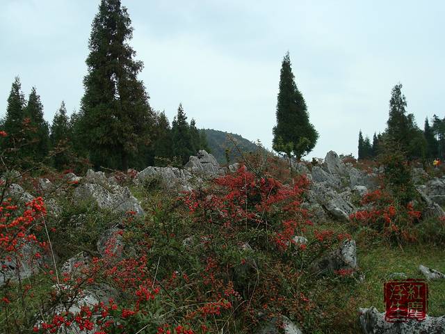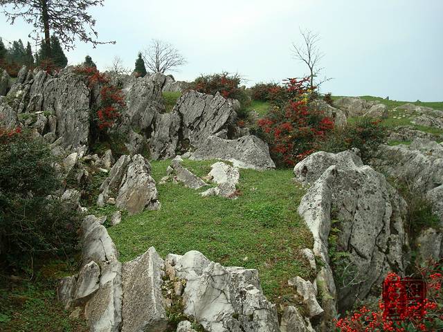 千野草场是典型的南方高山草场,兼有明显的喀斯特地貌伴随其中。绿草,奇石,红色火棘果便组合出了无数处微缩的自然盆景。这些集巧夺天工和令人无限遐想的微缩景观,再组合成为一幅大地为毯的巴东土家刺绣又是别有一番风情。
