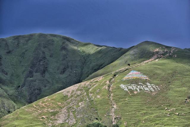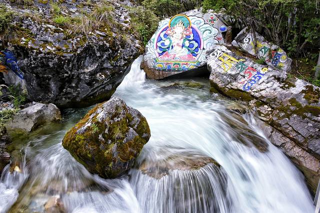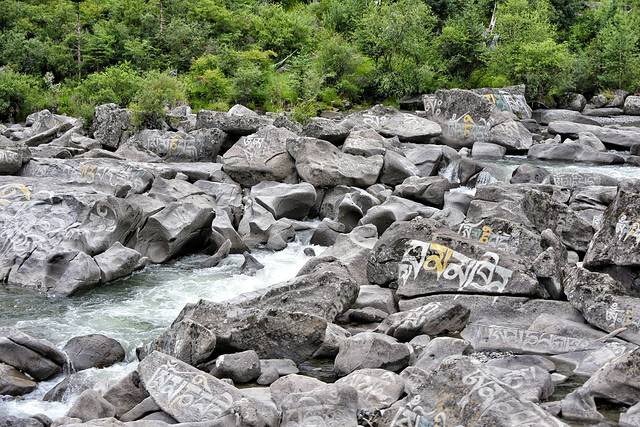 塔公到 新都桥 镇的路上,会看到一条河,河里的石头上满满的都是经文,山上的石头也是,看起来非常壮观。