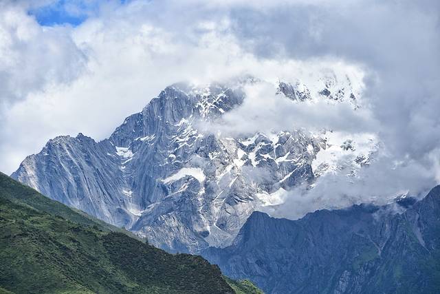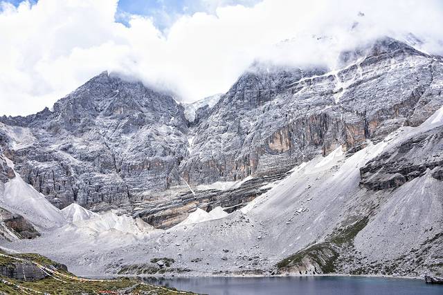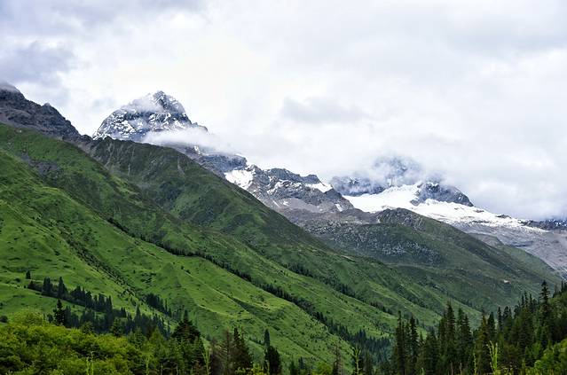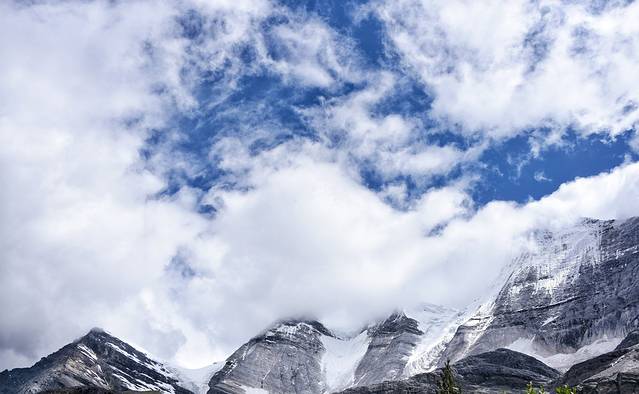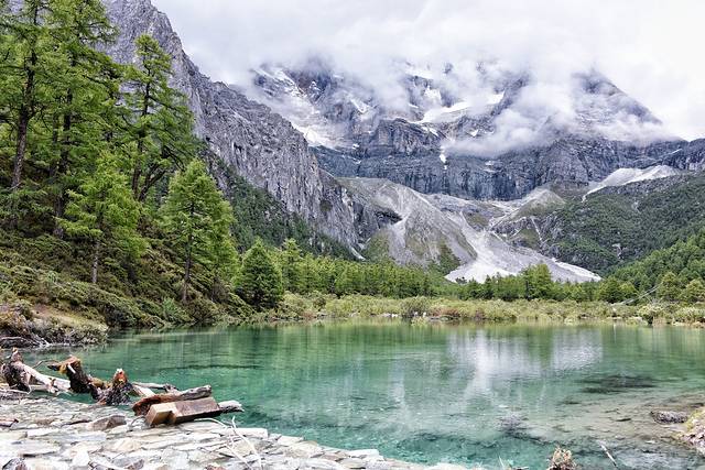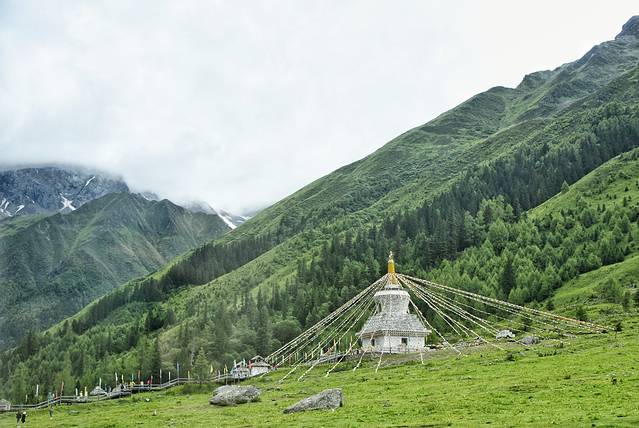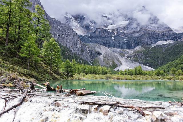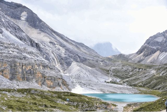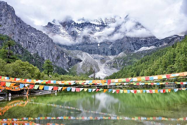 翻山越岭,终于见到了 亚丁 ,《消失的地平线》中描述的那个天空碧蓝如洗,雪峰层峦叠嶂,漂浮着绵绵云层的 亚丁 。夏季 亚丁 的天气就像是小孩子的脸,一会儿是艳 阳高 照,一会儿又阴雨绵绵。在从洛绒牛场到牛奶海的近4小时的徒步中,我们遭遇了两场雨,但能看到央迈勇和仙乃日的全貌,在牛奶海和五色海见到一小会儿的阳光,对于雨季在 亚丁 的我们来说已经是很幸运的事了。