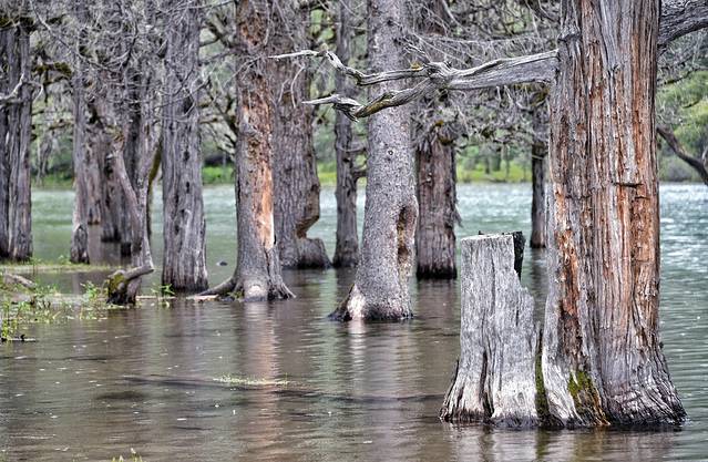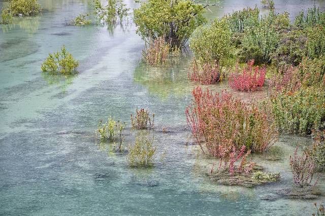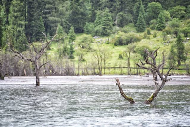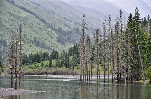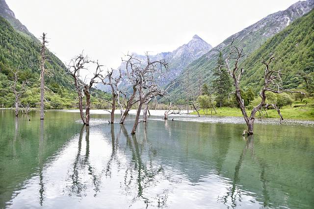 这是我比较喜欢的一个地方,盆景滩,枯死的古树在海子里以各自的姿势伫立着,即使是在阴雨天也别有一番趣味。