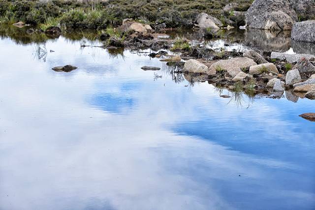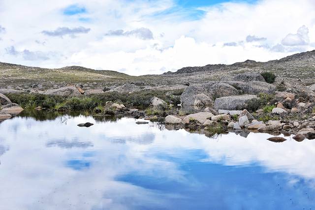 海子山实际上不是一座山而是一个自然保护区,一路上看到大大小小的海子和乱石滩,有些苍凉,却也不失一种蛮荒的美。雨后的天蓝得异常明净,小海子倒映着蓝天,像镜子一样。