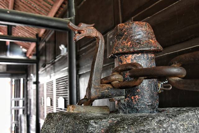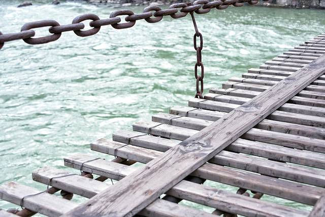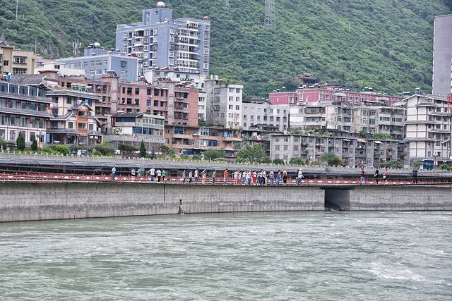 康熙时期就落成的 泸定 桥历时300多年依然如初,在经历的战争的枪林弹雨后,这座桥有了更非凡的意义,飞夺 泸定 桥的故事仿佛昨天方才听过。桥下 大渡河 水湍急奔腾,据说当年建桥时为了将13根铁索牵过桥,还牺牲了一位藏族力士。这座由13根铁索和木板构成的桥走起来竟没有特别摇晃的感觉,还有很多游客不停地在桥上蹦跳摇晃,木板没有铺满整个桥面,看起来让人有些紧张,实际上一点也不危险,不过拍照时还是得抓紧手机才行,不然掉进 大渡河 里就肯定捞不上来了。