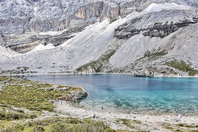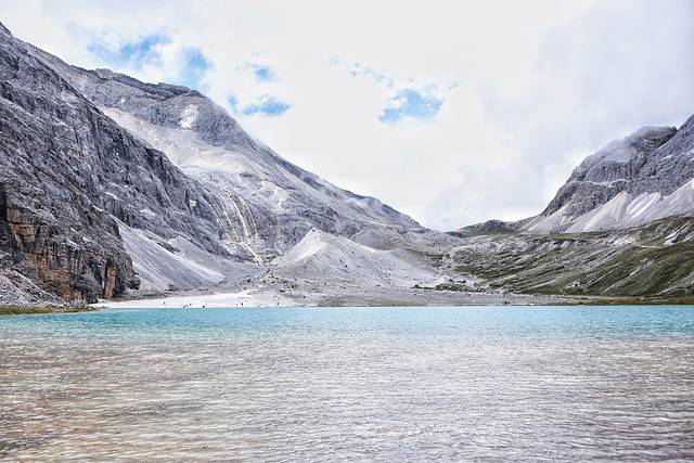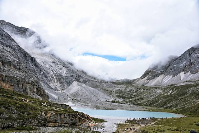 牛奶海在央迈勇的山坳里,看上去不是圆的而是扇形,海子中间是蓝色的雪水,而周边较浅的地方看上去像是围着的一圈乳白色边,而这圈乳白色大概就是传说中牛奶海的牛奶吧~