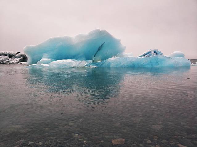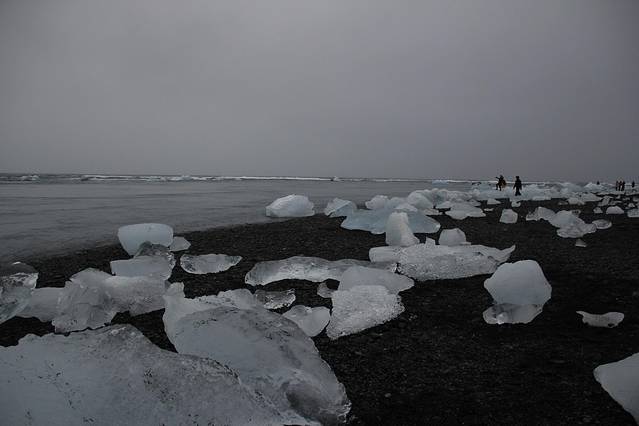 从Vik小镇向东向北,气候明显愈发寒冷。离开小镇不久,一场突如其来的大雪就让只有温暖南方驾驶经验的老司机懵了逼。小心翼翼地在风雪间慢慢穿行,终于有惊无险在约定的时间之前赶到了集合地点。此行最为激动人心的计划,参加索尔黑马冰川徒步团,近距离感受如同亘古不变的迷人冰山,在向导阿诺德的指导下攀爬蜿蜒蛇行的冰脊,纯洁无瑕的冰蓝色彩让人目眩神迷。下午,驱车抵达毗邻冰河湖的钻石沙滩,大块的浮冰在流向入海口前,总有一些被海浪冲到沙滩上,于是黑色的沙滩像一大幅柔软细腻的黑丝绒蔓展开来,迎接着不计其数的珠翠美玉。也终于领教到了冰岛变幻莫测的天气,时而风雨大作,时而又晴空万里。