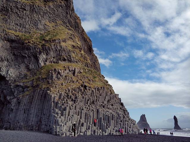 黑沙滩实在是冰岛非常经典的一处景点。如果大家还记得Day 1里Vik小镇夜景图,那么远处的礁石畔便是玄武石柱。上一次来时天色已暮,回程时趁着天色上佳,近距离感受了一下。巨大的玄武石柱如同通天之梯,游人们顾不得大西洋边呼啸的海风,在此流连忘返。悬崖上方盘桓不绝着的鸟群,整个黑沙滩有着冷酷肃杀的禁欲冰冷质感。