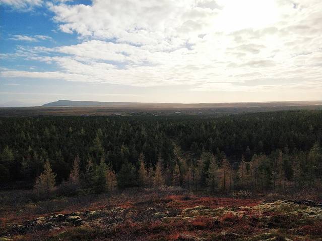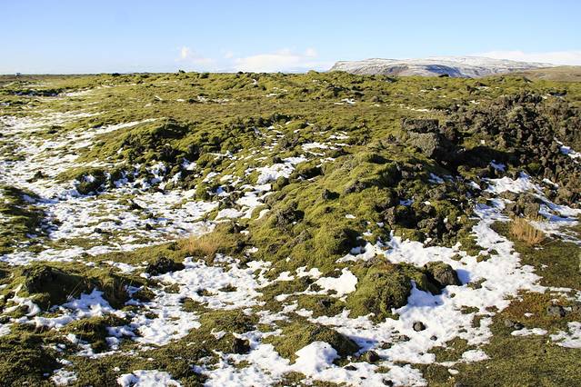 一眼望不到边的苔原。冰岛自然生长的树木很少,本应该长树的地方却遍布着苔藓。冷却了的岩浆石和火山灰使得这里连草都能难长出来,而顽强生长了几千年的苔藓是冰岛地表的主角。