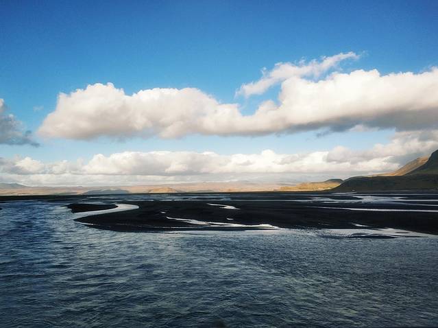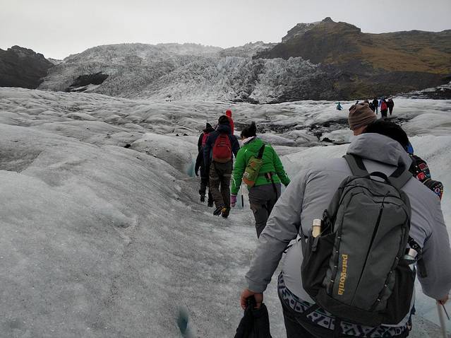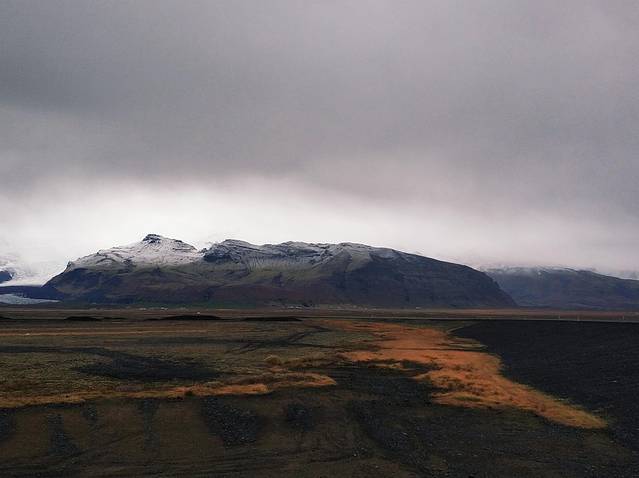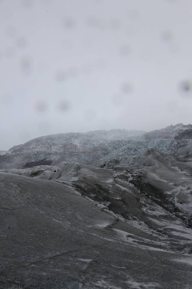 由于索尔黑马冰川下面有一座活火山,喷发出来的火山灰覆盖了整个冰川,所以这里的冰是和火山灰相互融合的,呈现出一片白黑的颜色。