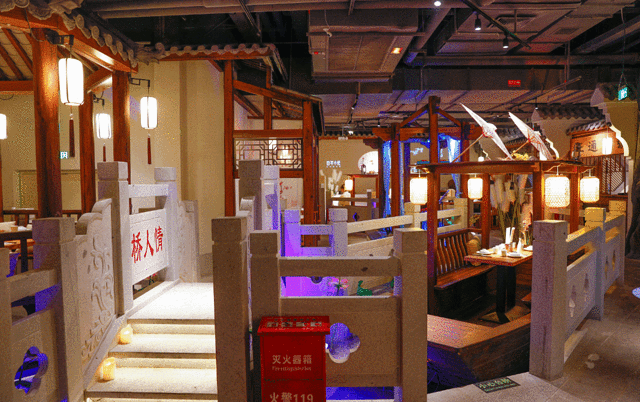 亭台楼阁,水榭轻舟,踏入这方古风食苑中仿佛穿越古代,一方诗意空间重现南宋繁华盛世,古装美人穿梭于廊亭之间,颇具美感。