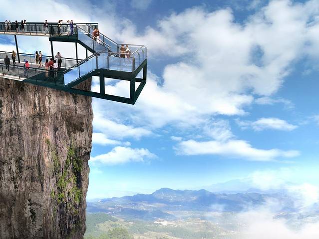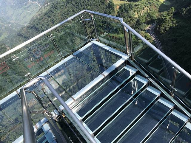 玻璃天梯台阶是全透明玻璃的,一步步扶摇直上,脚底下皆是悬崖,惊险刺激无比。给你一种一步步把悬崖踩在脚下的既视感。