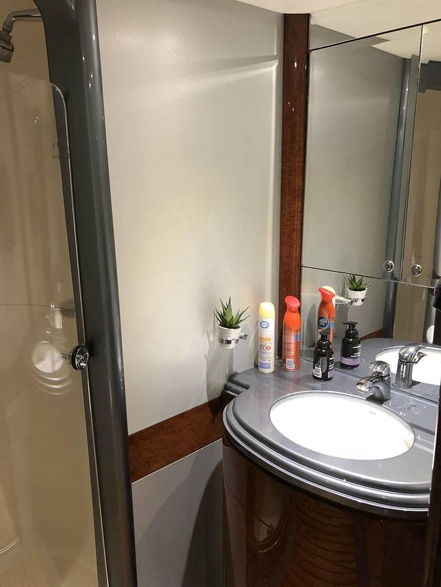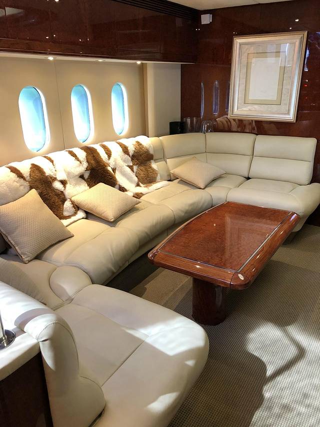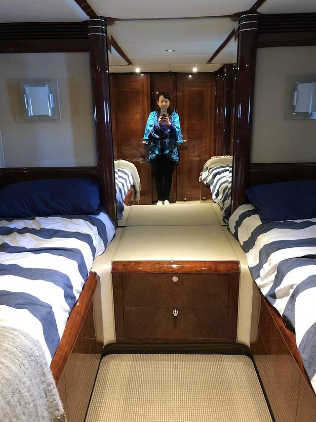 游艇分上下两层,上层是驾驶舱和会客厅,下面也有个会客厅,和几个房间。