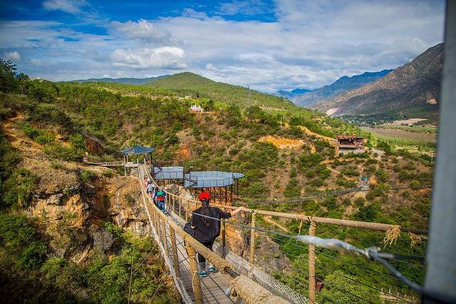 刚走进景区,就是一个长长的吊桥,通过吊桥便是一个很大的玻璃的观景台,清澈的蓝天白云下面,可以看见金沙江水滚滚而过。