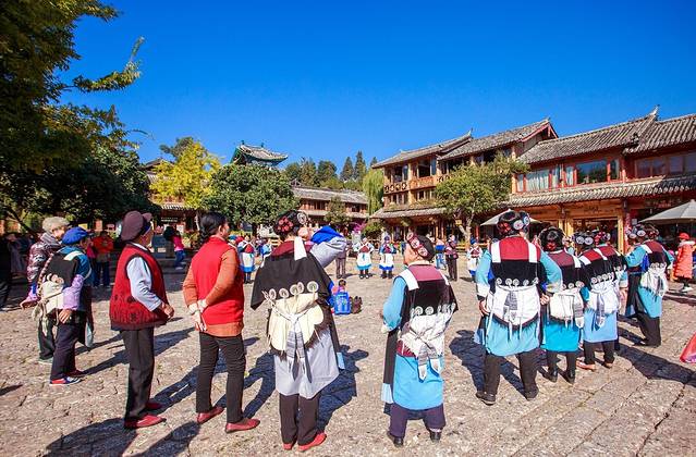 每天早上,四方街上一群身着少数民族服装的老人围在一起跳舞是也一道特别的风景线。
