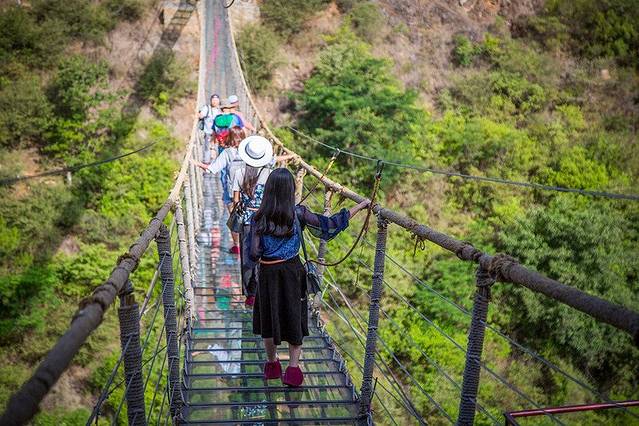 在玻璃栈道起点换上鞋套,便可以踏上长度约百米,大约五六十米高度的玻璃栈道了。站在玻璃桥上面,清晰的可以看见脚下的山崖,待到走动之时,桥越发的的晃动真是让人心惊胆战。因为是景区必经之路,所以实在害怕的宝宝们,最好系上安全带,这样就可以保证完全的安全啦。