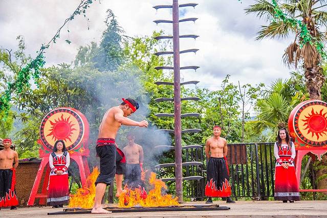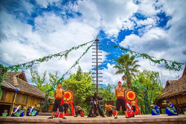 傣族村寨正在表演上刀山下火海的惊险刺激表演,这可是实打实的刀山啊,还邀请游客上台一辩真假过。如果是特殊人群看到心脏受不了的话,就要适可而止。毕竟都是真枪实干的表演呢!