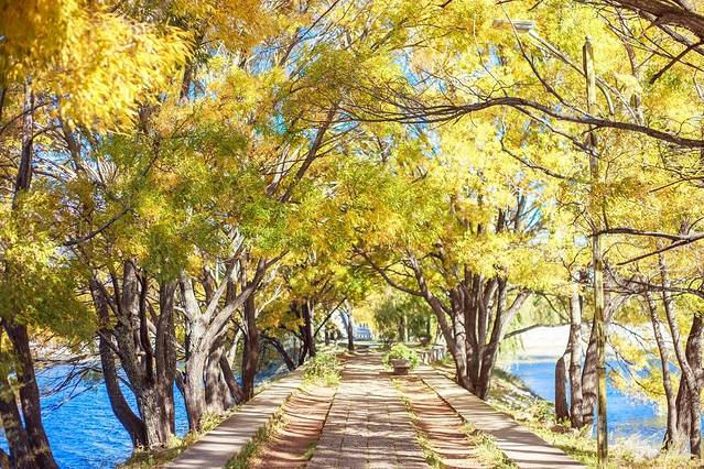 秋天的柳树变得金黄,风一吹发出沙沙响声,叶子飘落在水面上的场景美极了。