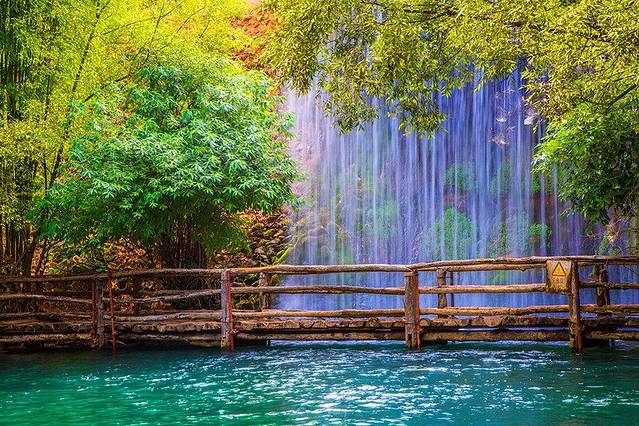 待下到谷底后,一副巨大的山泉水瀑挂在眼前,这里绿意盎然,青葱一片,伴随着水汽的升腾越发的清凉舒适,特别是那一片片茂密的竹林,实在是世外桃源之感。